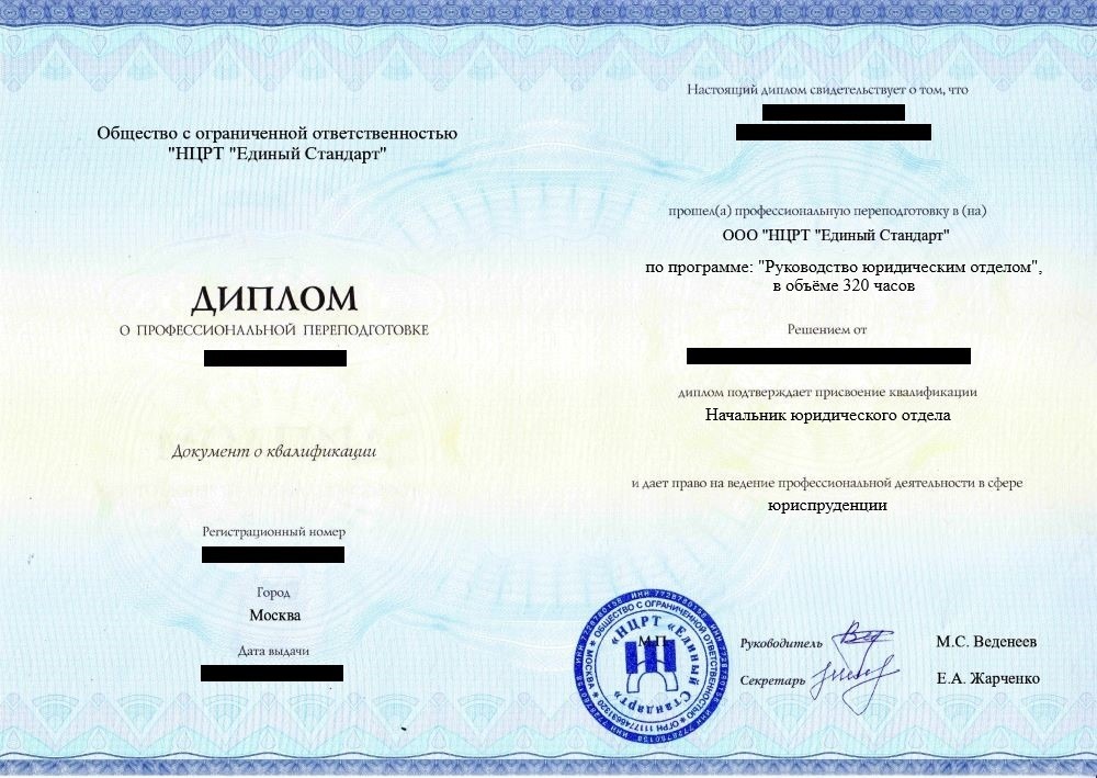 • «Начальник юридического отдела» с правом работы в сфере юриспруденции
